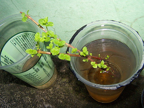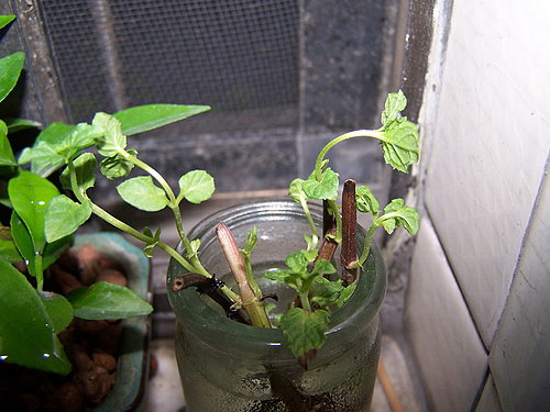 剩下的殘枝把它泡在水中,慢慢的過幾天後也慢慢開始發新的芽,底部也慢慢長出跟來,再過幾天就可以移到盆子裡種了。