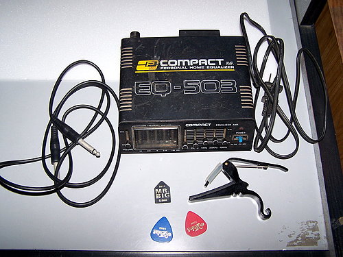 至於另一把二手電吉他,純粹自HIGH用,因為沒有專門的效果器,所以只能接上簡單的EQ,加上喇叭擴音,躲在房間亂彈亂唱,純粹發洩用,現在下場,就是分屍研究構造後,從此無法再發聲,一樣的封印在衣櫥裡面。