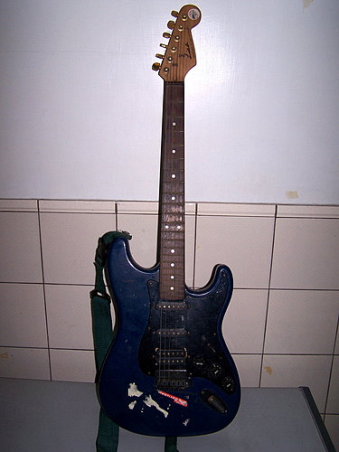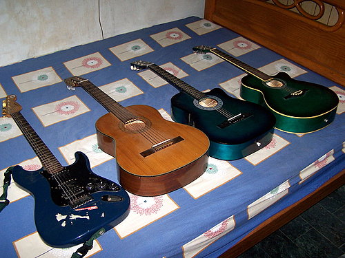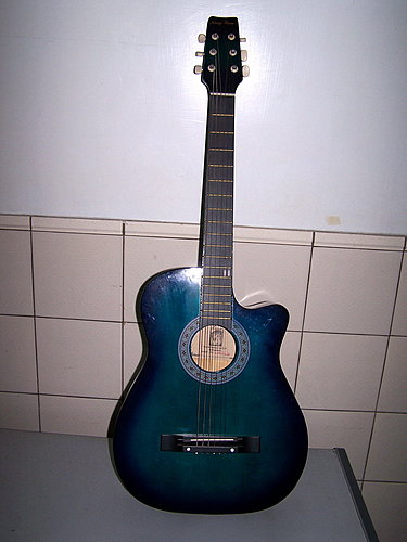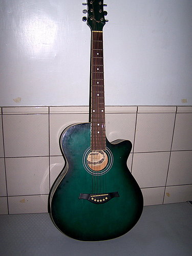 就這樣玩到大四,終於花錢去網路買了一把二手民謠及一把二手電吉他,從此之後,古典吉他從此封印起來,開始玩民謠了,第二把吉他簡稱【小綠】,買來不到三天就摔到斷頭,心馬上涼了半截,還好並不嚴重用快乾還可以黏回來。有了民謠終於可以快樂的彈彈唱唱,就這樣【小綠】一直陪我到現在。