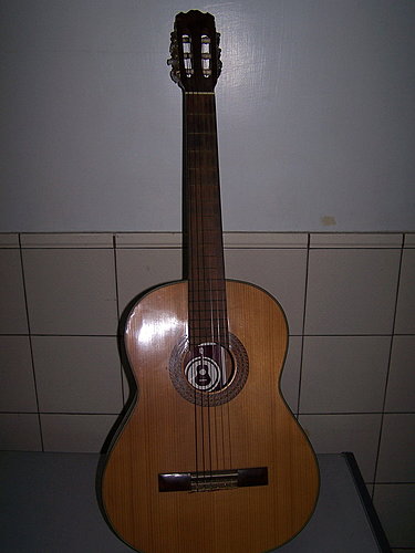下一把吉他,是在今年去大陸時,晚上超無聊所以就去樂器行買的,折合台幣約700約塊。換句話說,就是去大陸時無聊花錢包的二奶,不過還是把它給帶回台灣。由於是大陸貨,音質並不會很好,介於民謠與古典之間的音色,下場是,打入冷宮,偶爾寵幸一下。
