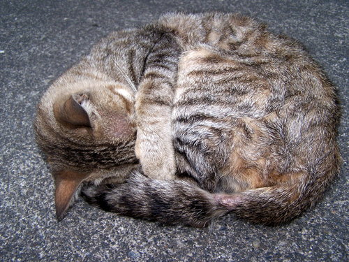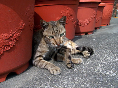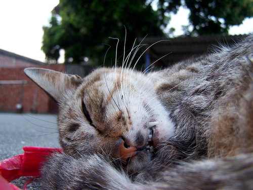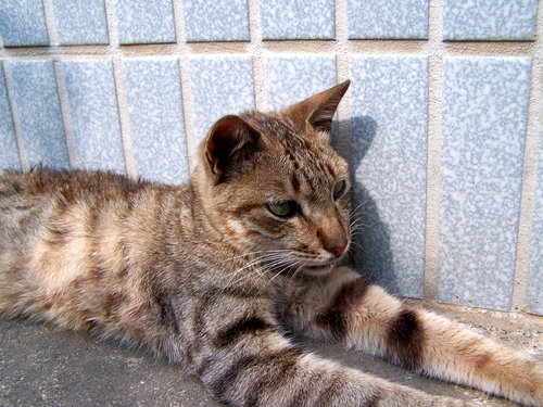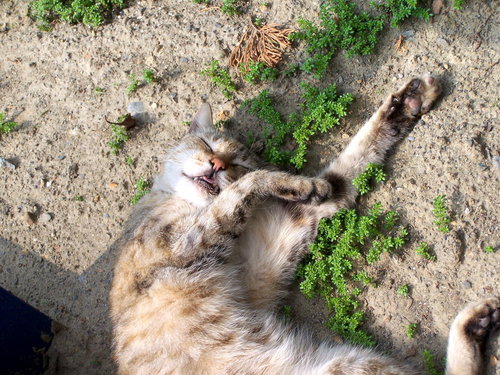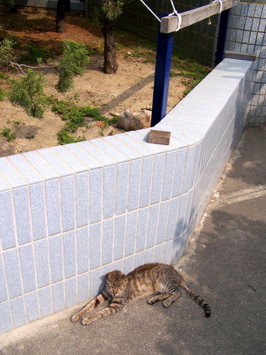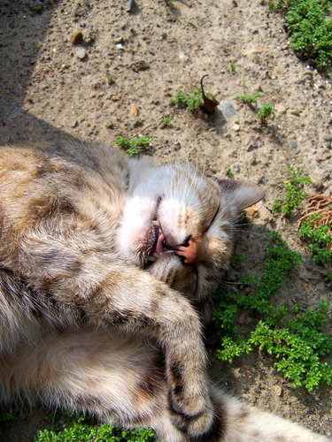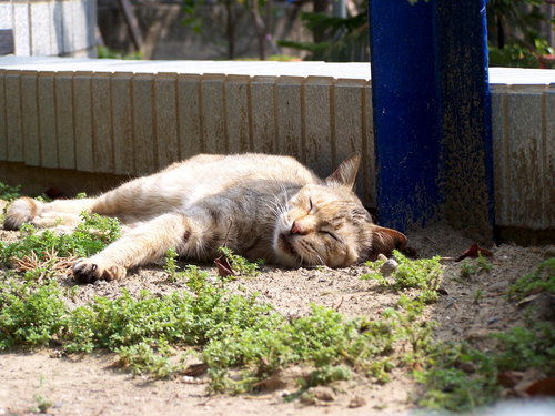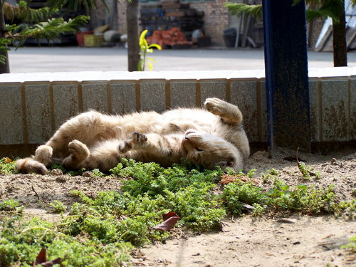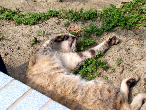 2009.3.15  So weird weather,星期五大熱天,星期六瞬間變冷,今天又回暖,還真奇怪的三月天。難得今天下午太陽有露臉,作了點日光浴曬一下陽光順便找阿虎玩,阿虎跟母貓一樣也是在享受著日光浴,沒想到母貓竟然會有跟阿虎一樣的投降式睡姿。