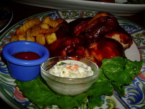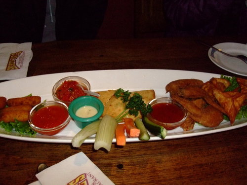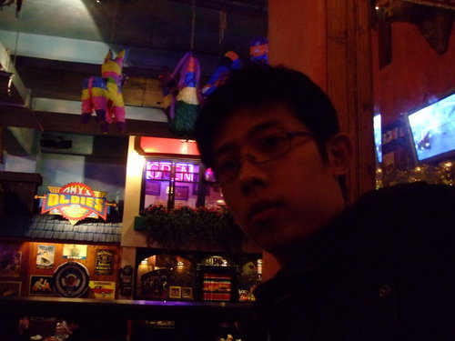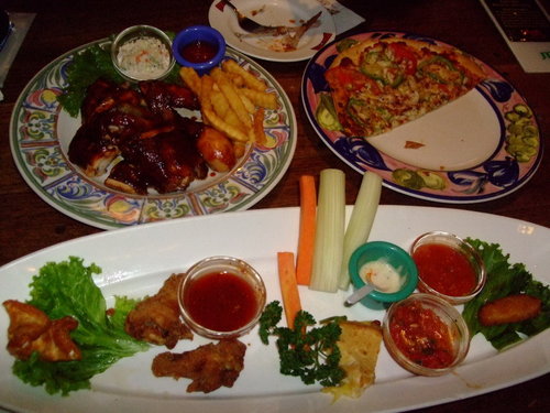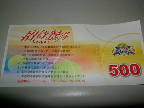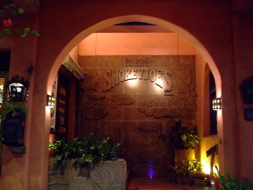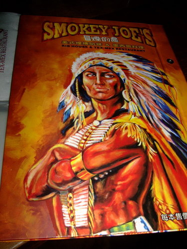 Smokey Joe's   2009.3.14 跟之前的同事聚餐,這次選了高檔的美式餐廳【冒煙的喬】-自由店,每人各點一分主餐大家一起Share,星期六人潮還蠻多的也有不少老外。 裡面裝潢就是美式印地安風格,打開MENU 有單點也有套餐,而且總類也很多,連中式餐點也有,不過在美式餐廳點中國菜會不會有點怪?   MENU-每本售價500  (可以吃嗎?)   三個人各點了,總匯拼盤、燻雞薄皮PIZZA、烤雞+飲料   最後結帳時使用一張消費券就加送等值折價券,不過要下次消費滿2000才能折價