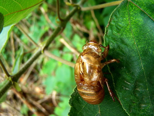 田邊的樹林裡都是蟬,而樹下到處可以看到裞皮之後的軀殼,可憐的蟬在地底蟄伏五年,出土羽化後生命卻只有一個夏天。 (蟬的一生)