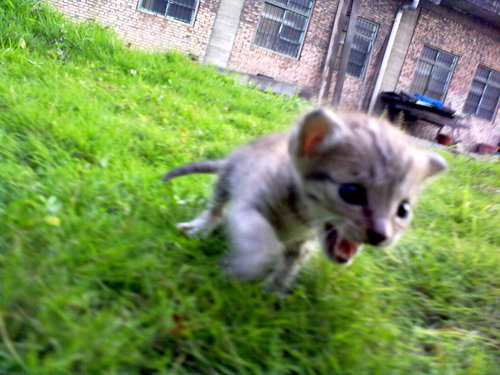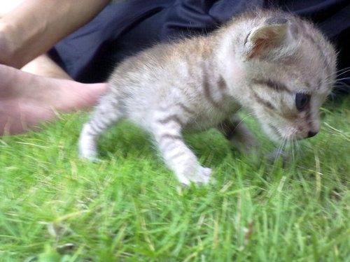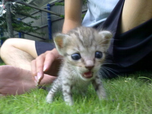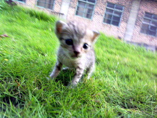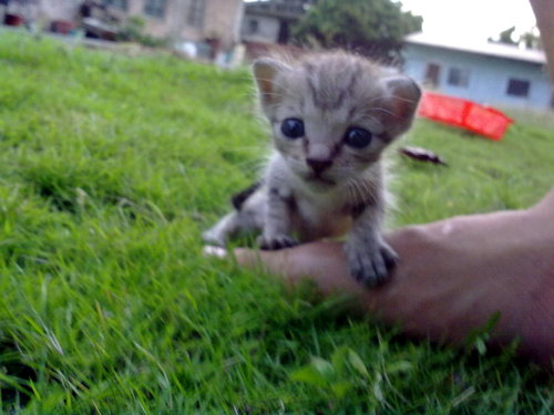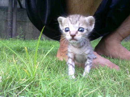 小喵屬於虎斑貓、偏灰色、短耳、淡淡的藍眼珠,就姑且暱稱【小灰】,剛收養時全身髒兮兮,還沒斷奶於是強迫母貓餵奶,可是效果有限,於是就拿燙熟的【蚵仔】餵食,經過一星期調養,慢慢的身體也越來越健康了。